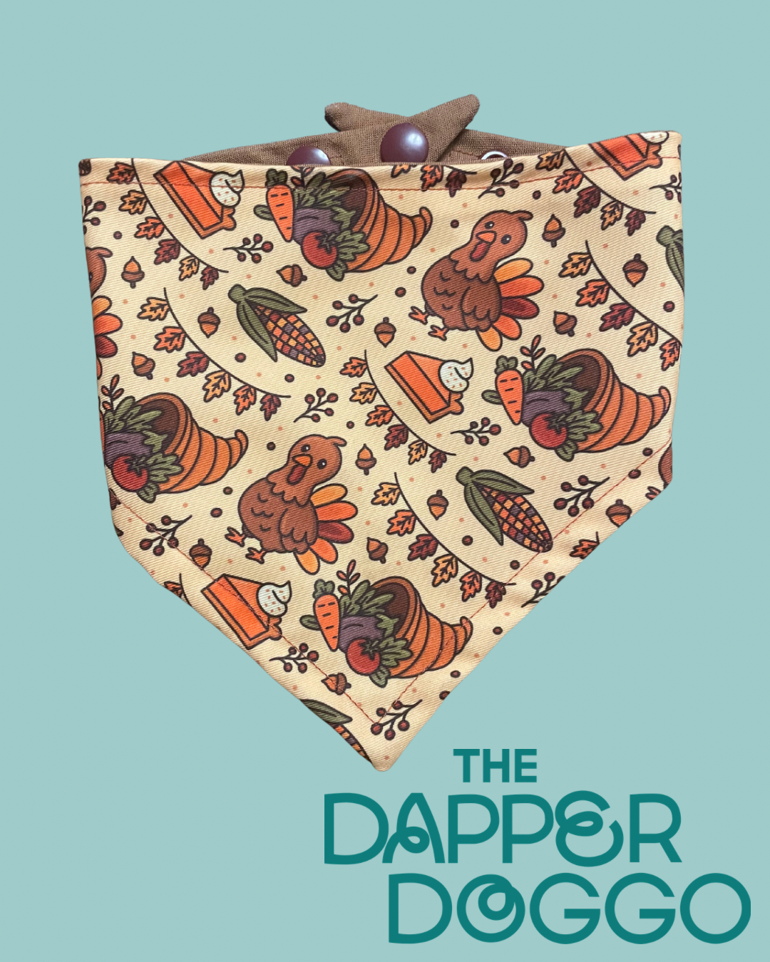 Get your pup ready for the feast! Our Thanksgiving Dog Bandana is the perfect accessory to dress up your dapper dog for fall photos, turkey dinners, and family gatherings. This cheerful print captures all the best parts of the season in one stylish, comfortable accessory.