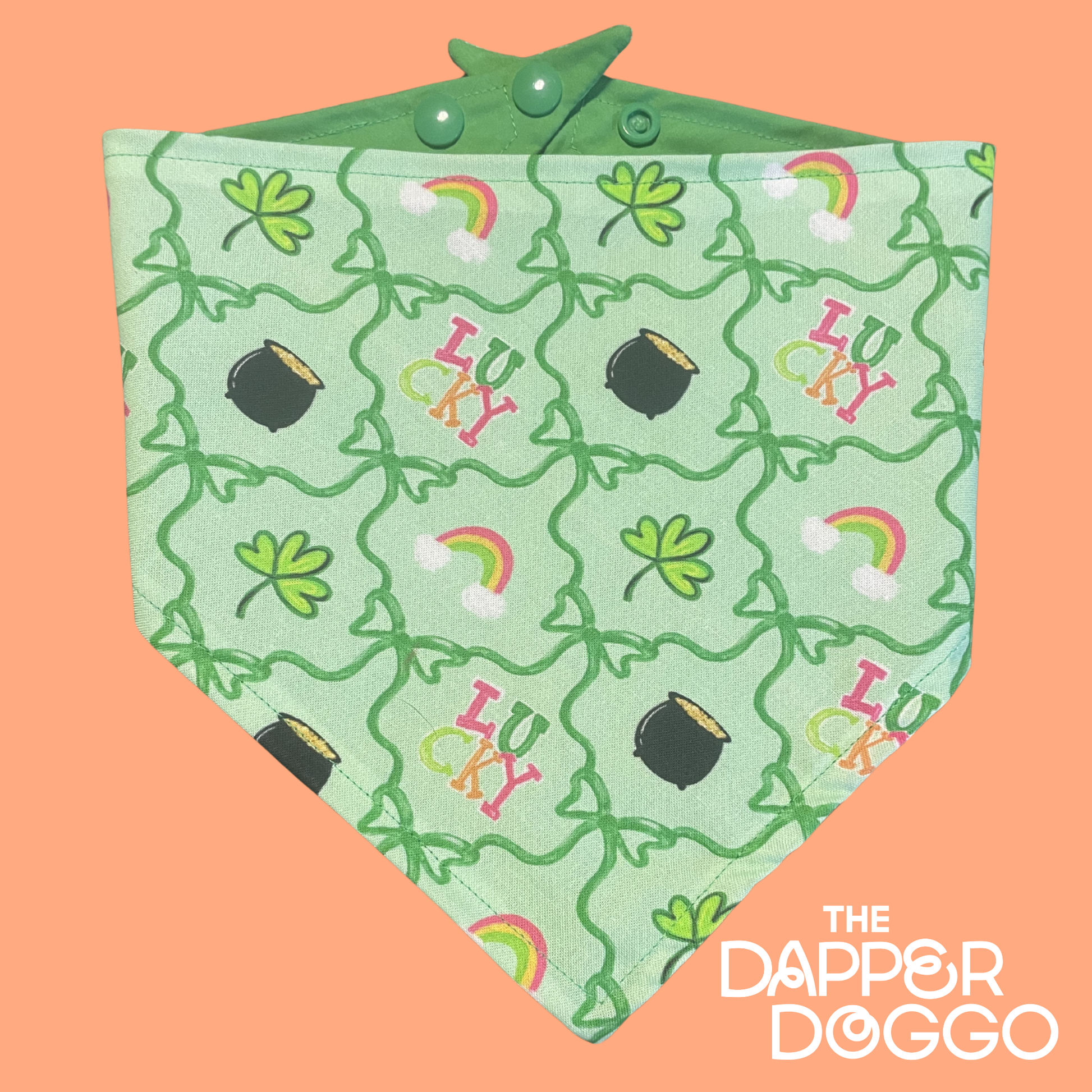 The Lucky Charm Cutie Dog Bandana features playful shamrocks, rainbows, lucky pots of gold, and colorful “Lucky” lettering on a fresh mint green background. It’s festive, fun, and made for dogs who know they’re everyone’s good luck charm.