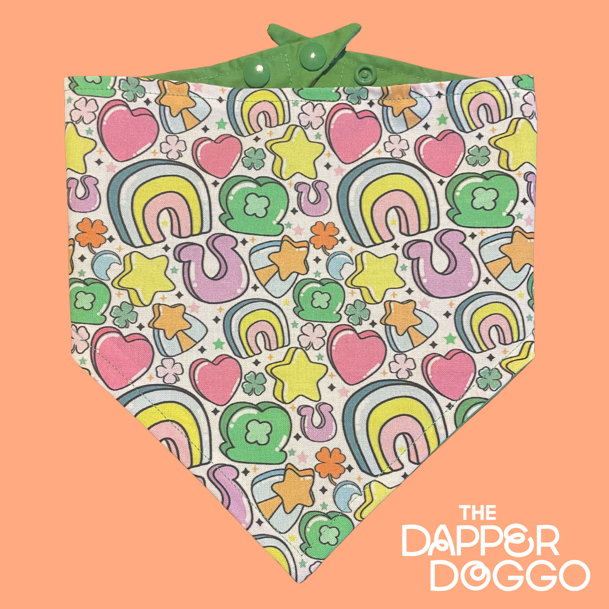The Retro Lucky Pup Dog Bandana blends playful rainbows, pastel hearts, lucky horseshoes, stars, and shamrocks into one adorable statement piece. It’s giving groovy St. Paddy’s vibes — perfect for pups who love bold color and attention.
