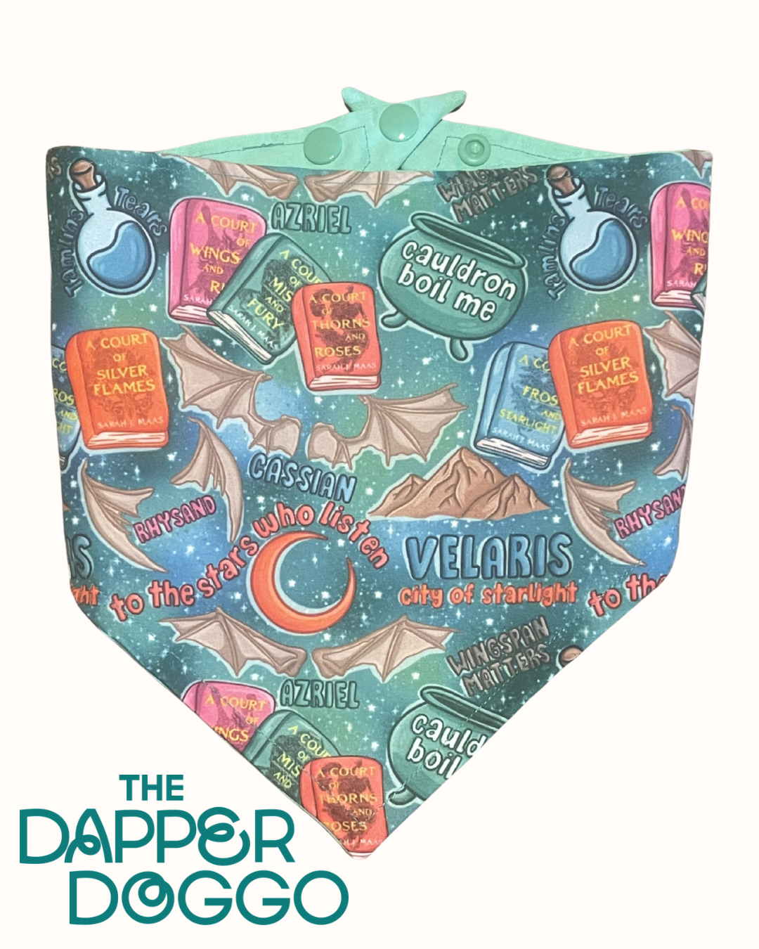"To the stars who listen—and the pups who bark." Capture the magic of the Hidden City with our Velaris-inspired dog bandana. This design is packed with "Easter eggs" for true SJM fans: the mountains of Ramiel, bat wings for our favorite Illyrian trio (Rhysand, Cassian, and Azriel), and the iconic "Cauldron boil me" catchphrase.